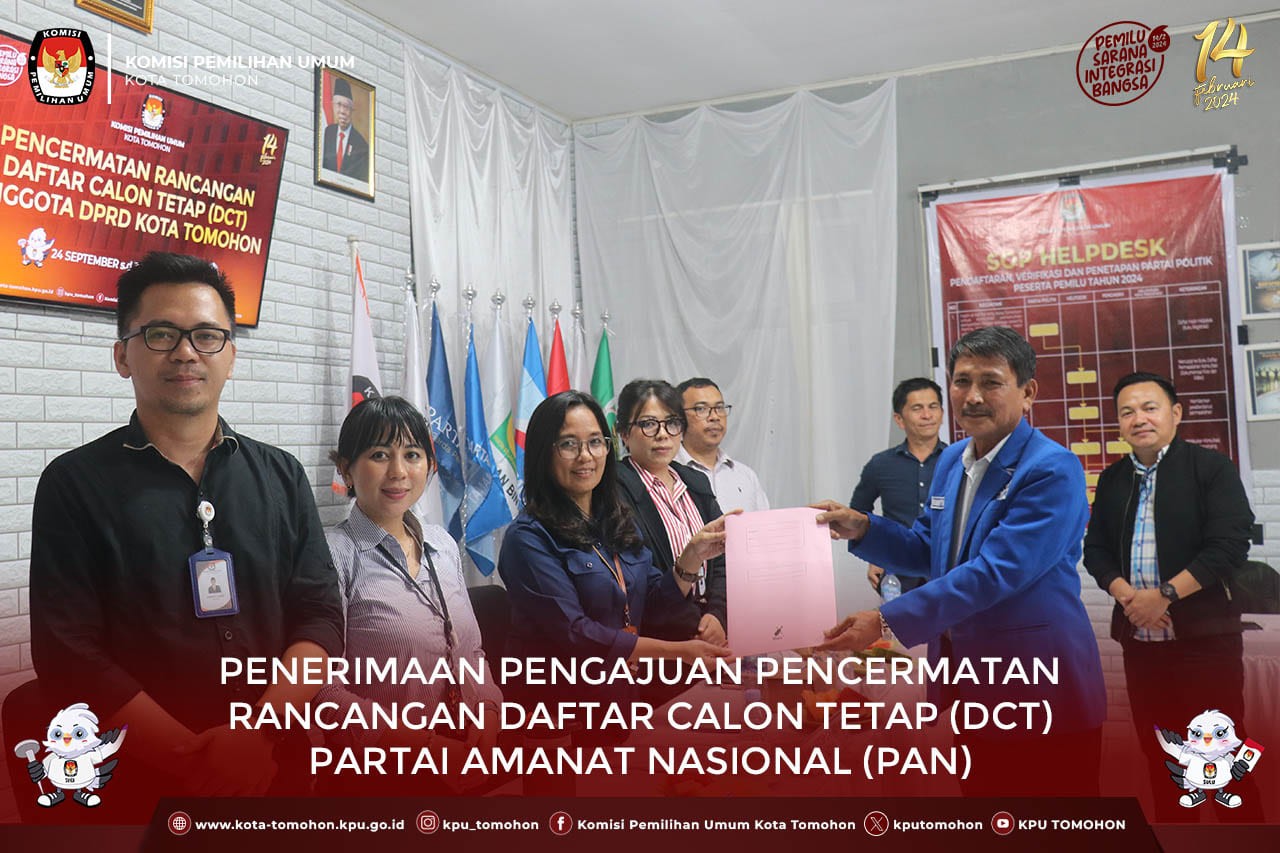 Partai Amanat Nasional (PAN) merupakan Partai Politik Ketujuh yang melakukan Pengajuan Pencermatan Rancangan Daftar Calon Tetap (DCT) Anggota DPRD ke KPU Kota Tomohon.