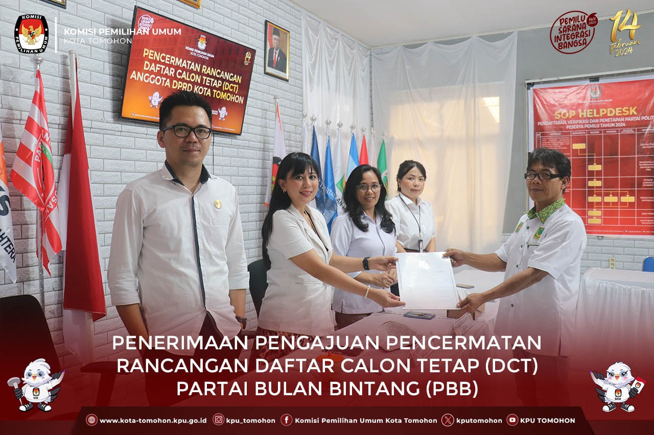 Partai Bulan Bintang (PBB) merupakan Partai Politik Pertama yang melakukan Pengajuan Pencermatan Rancangan Daftar Calon Tetap (DCT) Anggota DPRD ke KPU Kota Tomohon.