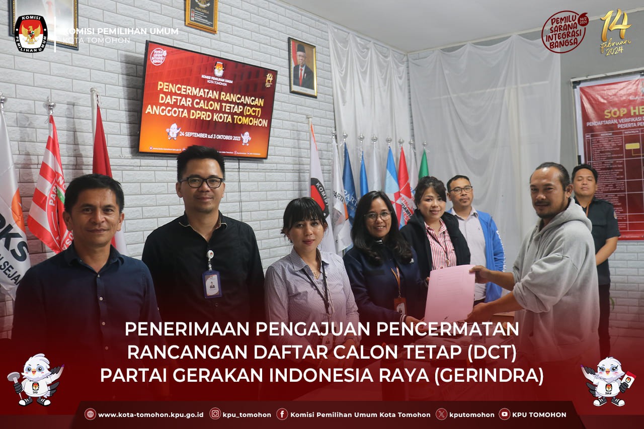 Partai Gerakan Indonesia Raya (Gerindra) merupakan Partai Politik Kesepuluh yang melakukan Pengajuan Pencermatan Rancangan Daftar Calon Tetap (DCT) Anggota DPRD ke KPU Kota Tomohon.