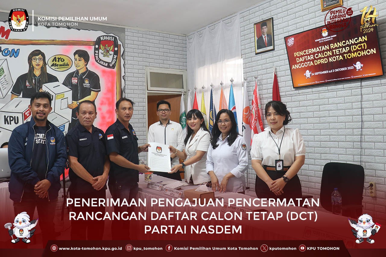 Partai Nasdem merupakan Partai Politik Kedua yang melakukan Pengajuan Pencermatan Rancangan Daftar Calon Tetap (DCT) Anggota DPRD ke KPU Kota Tomohon.