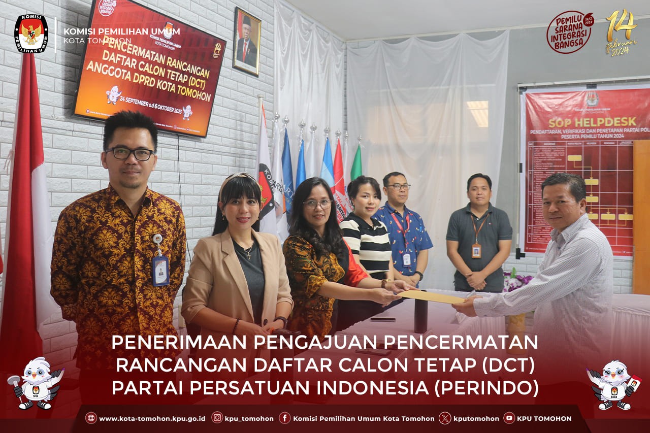 Partai Persatuan Indonesia (Perindo) merupakan Partai Politik Kesebeleas yang melakukan Pengajuan Pencermatan Rancangan Daftar Calon Tetap (DCT) Anggota DPRD ke KPU Kota Tomohon.