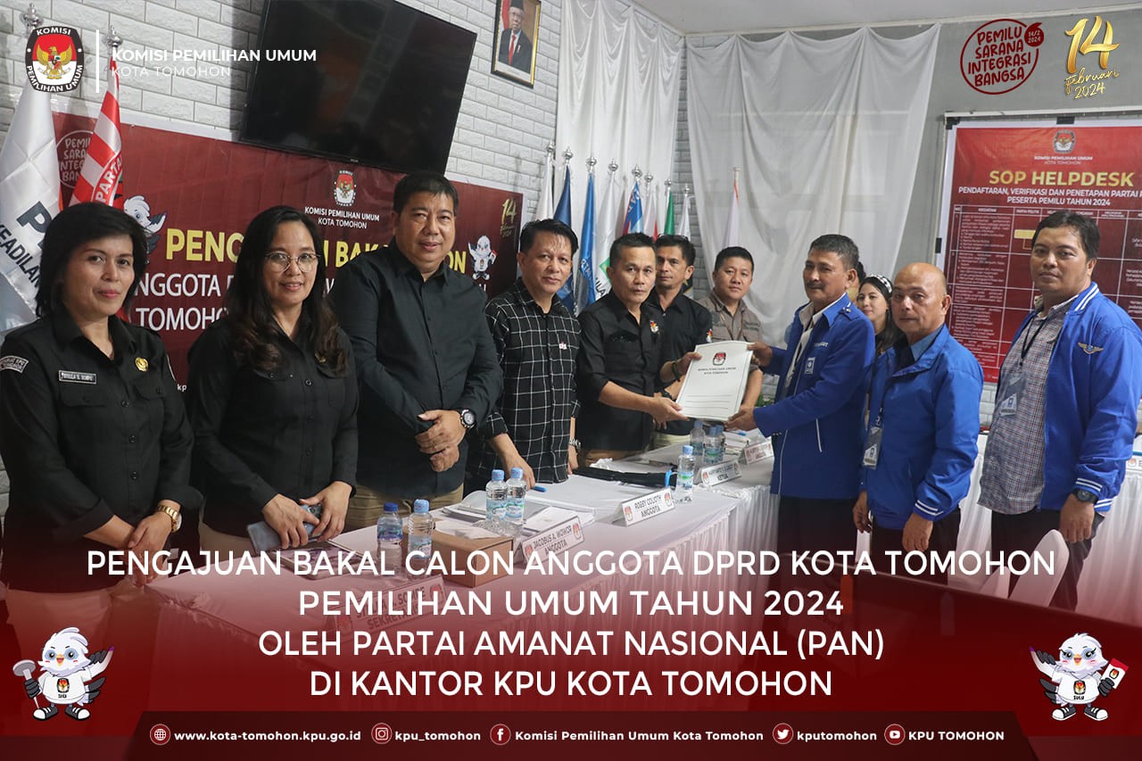 Tomohon, kota-tomohon.kpu.go.id - Partai Amanat Nasional (PAN) mengajukan Bakal Calon Anggota DPRD Kota Tomohon Pemilu Tahun 2024, Minggu (14/5) di Kantor KPU Kota Tomohon. Pengajuan dilakukan langsung oleh Ketua Sonny Lapian didampingi Sekretaris Josef Mantiri, Bendahara dan pengurus serta bakal calon, Pukul 18.50 WITA.