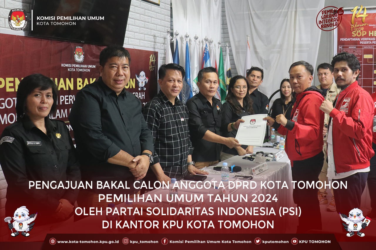 Tomohon, kota-tomohon.kpu.go.id - Partai Solidaritas Indonesia (PSI) mengajukan Bakal Calon Anggota DPRD Kota Tomohon Pemilu Tahun 2024, Minggu (14/5) di Kantor KPU Kota Tomohon. Pengajuan dilakukan langsung oleh Ketua Audy Kalangi didampingi Sekretaris Yeremia Paat dan pengurus serta bakal calon, Pukul 21.42 WITA.