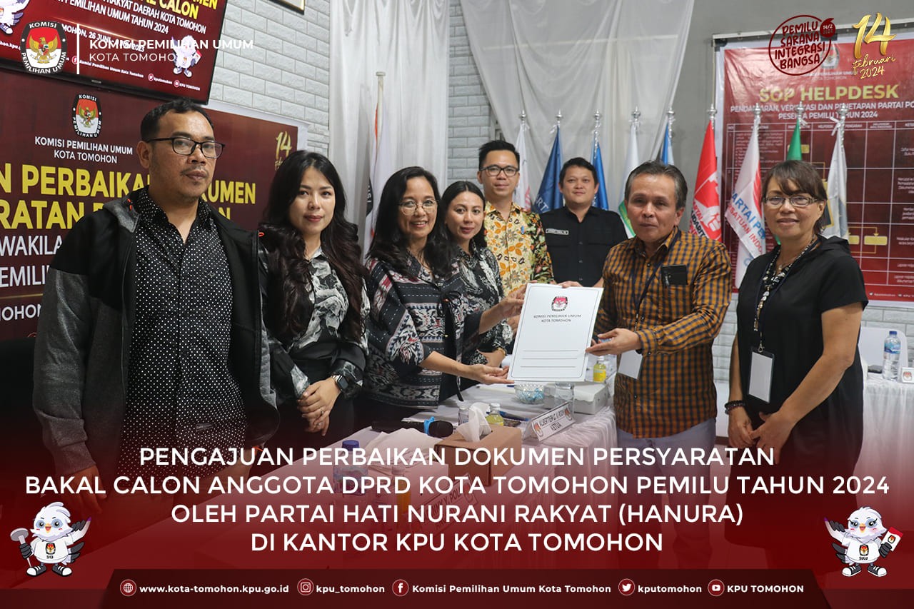 Setelah dilakukan penelitian, KPU Tomohon menyatakan hasil akhir Dokumen Pengajuan Perbaikan Partai Hanura diterima.