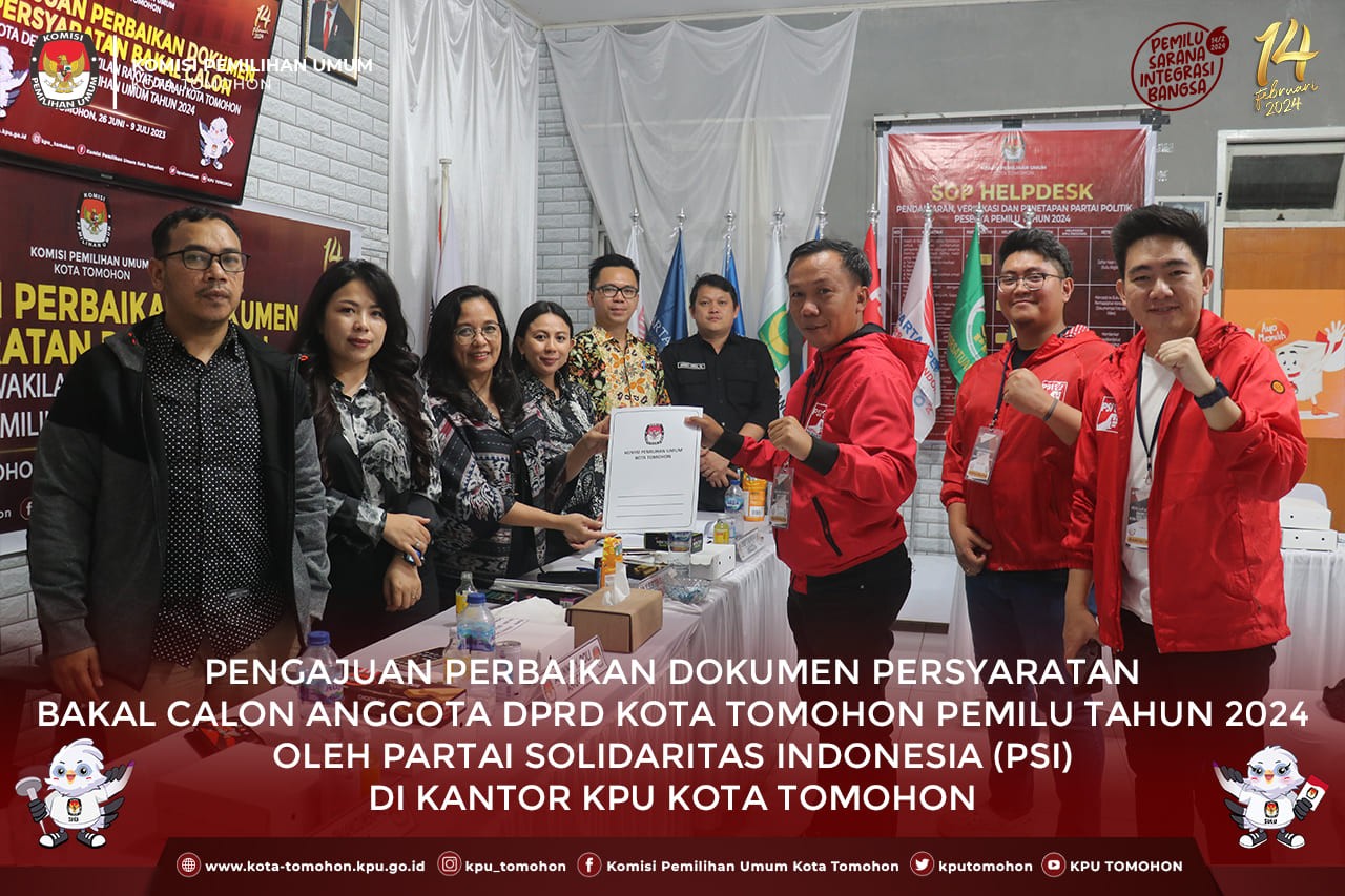Tomohon, kota-tomohon.kpu.go.id - Partai Solidaritas Indonesia (PSI) mengajukan Perbaikan Dokumen Persyaratan Bakal Calon Anggota DPRD Kota Tomohon Pemilu Tahun 2024, Minggu (9/7) di Kantor KPU Kota Tomohon. Pengajuan dilakukan langsung oleh Ketua Audy Kalangi didampingi Pengurus Partai, Pukul 23.00 WITA.