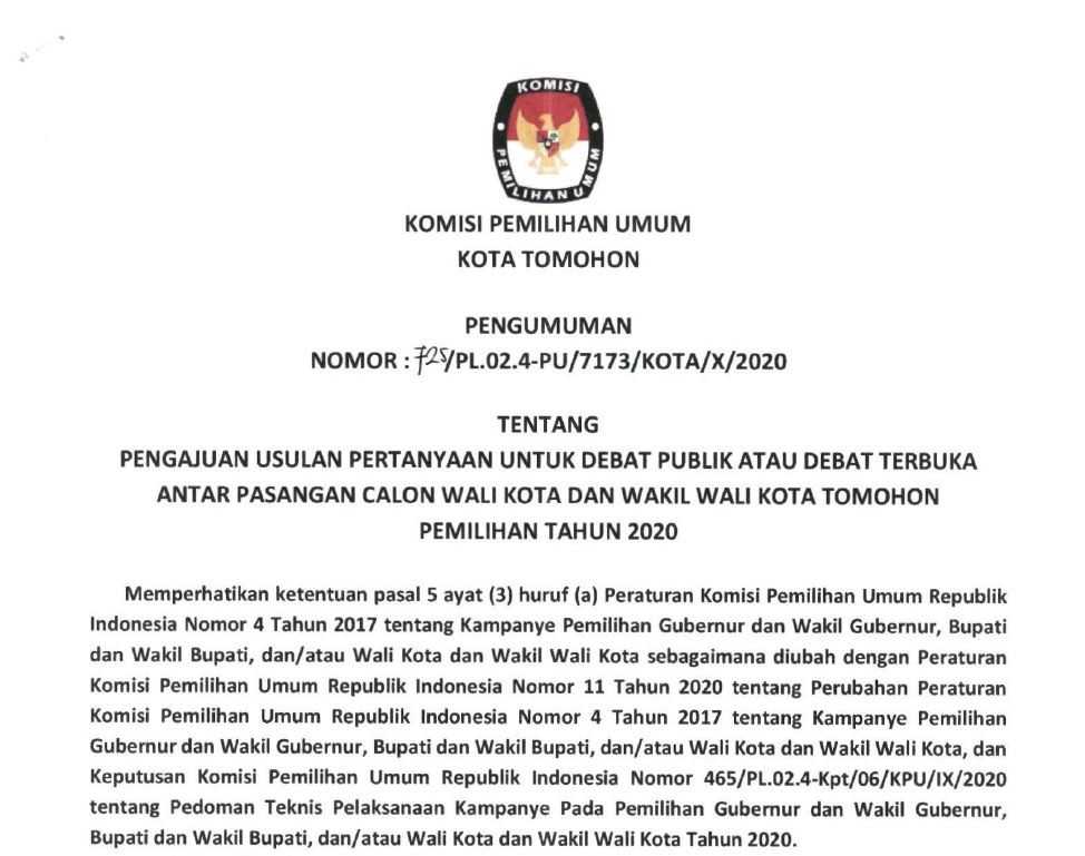 Pengajuan Usulan Pertanyaan Untuk Debat Publik atau Debat Terbuka antar Pasangan Calon Wali Kota dan Wakil Wali Kota Tomohon Pemilihan Tahun 2020
