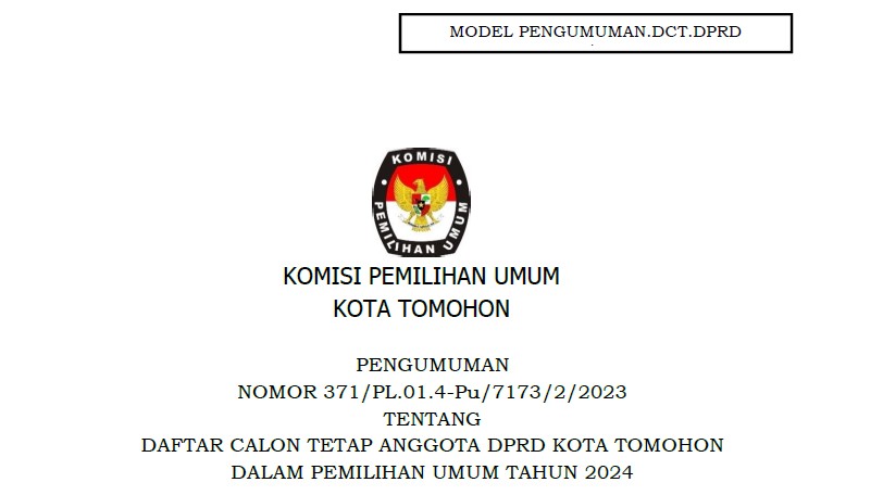 Pengumuman Daftar Calon Tetap (DCT) Anggota DPRD Kota Tomohon dalam Pemilihan Umum Tahun 2024