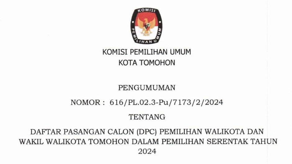 Berdasarkan Pasal 123 Ayat (1) Peraturan Komisi Pemilihan Umum Nomor 8 Tahun 2024 tentang Pencalonan Gubernur dan Wakil Gubernur, Bupati dan Wakil Bupati, serta Walikota dan Wakil Walikota, sebagaimana dirubah dengan Peraturan Komisi Pemilihan Umum Nomor 10 Tahun 2024, dengan memperhatikan Keputusan Komisi Pemilihan Umum Kota Tomohon Nomor 329 Tahun 2024 tentang Penetapan Nomor Urut Pasangan Calon Peserta Pemilihan Walikota Dan Wakil Walikota Tomohon Tahun 2024, yang ditetapkan tanggal 23 September 2024. Berikut diumumkan Daftar Pasangan Calon (DPC) Pemilihan Walikota Dan Wakil Walikota Tomohon dalam Pemilihan Serentak Tahun 2024 sebagaimana terlampir.