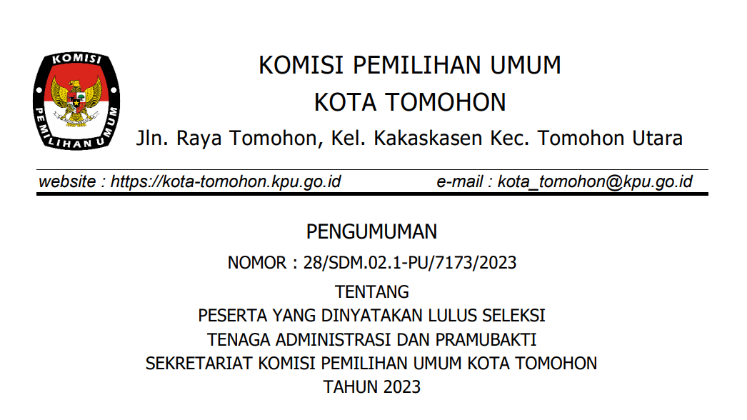 Pengumuman Hasil Lulus Seleksi Tenaga Administrasi dan Pramubakti Sekretariat KPU Kota Tomohon Tahun 2023