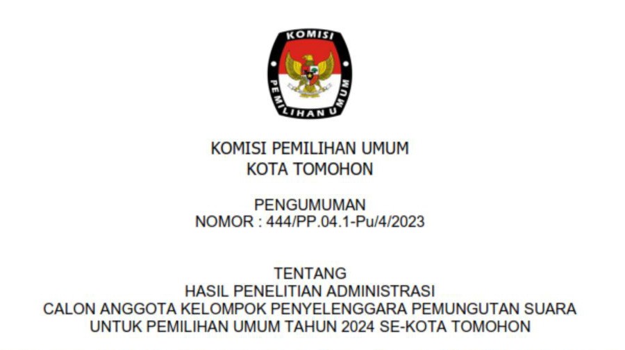 Pengumuman Hasil Penelitian Administrasi Calon Anggota Kelompok Penyelenggara Pemungutan Suara (KPPS) untuk Pemilihan Umum Tahun 2024 se-Kota Tomohon