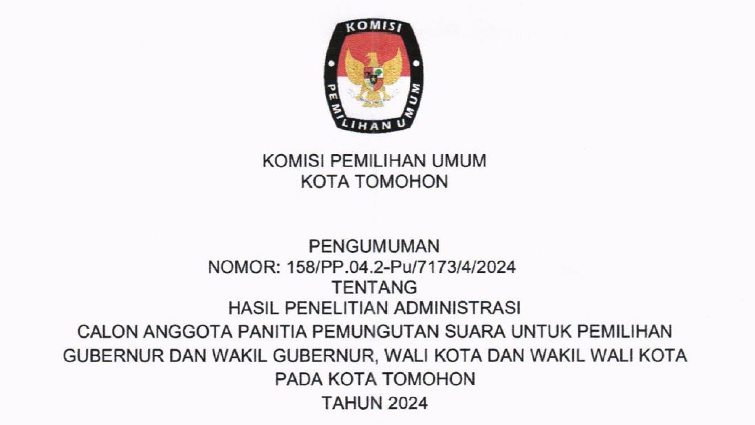 Pengumuman Hasil Penelitian Administrasi Calon Anggota Panitia Pemungutan Suara untuk Pemilihan Gubernur dan Wakil Gubernur dan Wali Kota dan Wakil Wali Kota pada Kota Tomohon Tahun 2024