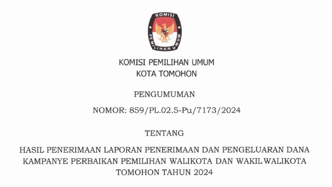 Pengumuman Hasil Penerimaan Laporan Penerimaan dan Pengeluaran Dana Kampanye Perbaikan Pemilihan Walikota dan Wakil Walikota Tomohon Tahun 2024