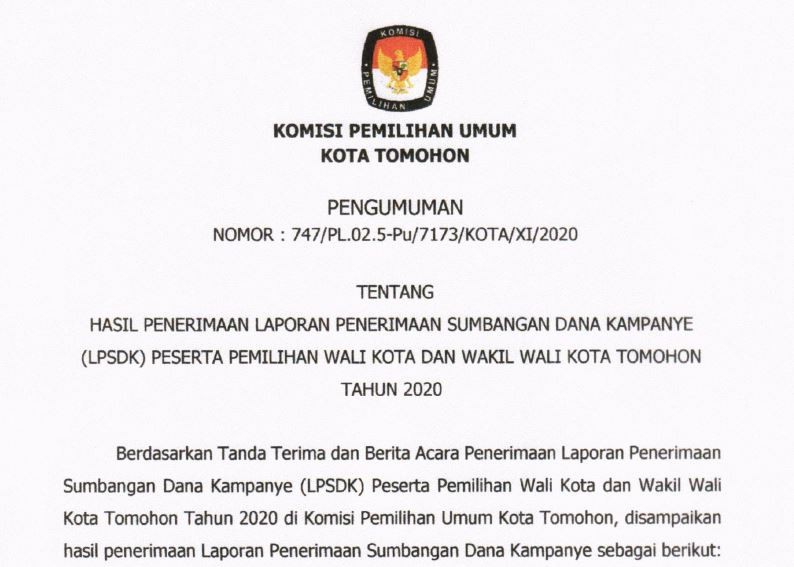PENGUMUMAN LPSDK PESERTA PEMILIHAN WALI KOTA DAN WAKIL WALI KOTA TOMOHON