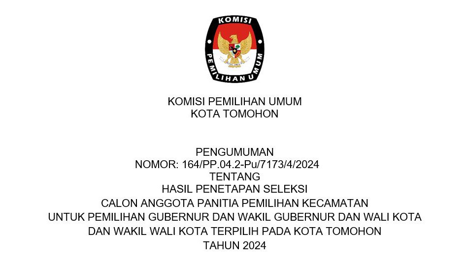 Pengumuman Hasil Penetapan Seleksi Calon Anggota Panitia Pemilihan Kecamatan untuk Pemilihan Gubernur dan Wakil Gubernur, Wali Kota dan Wakil Wali Kota Terpilih pada Kota Tomohon Tahun 2024
