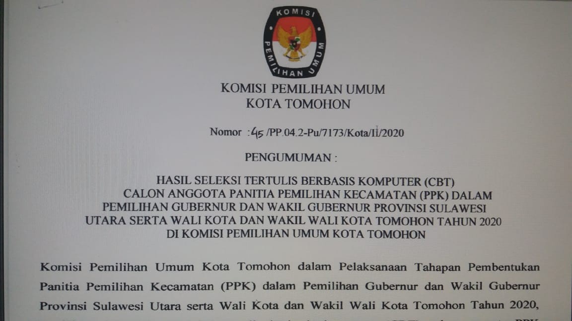 Berdasarkan hasil tes tertulis, KPU Kota Tomohon mengumumkan nama-nama yang telah lulus dalam keputusan Komisi Pemilihan Umum Nomor: 45/PP.04.2-Pu/7173/Kota/II/2020 tentang Hasil Seleksi Tertulis Berbasis Komputer (CBT) Calon Anggota Panitia Pemilihan Kecamatan (PPK) dalam Pemilihan Gubernur dan Wakil Gubernur Provinsi Sulawesi Utara serta Wali Kota dan Wakil Wali Kota Tomohon Tahun 2020 di Komisi Pemilihan Umum Kota Tomohon.