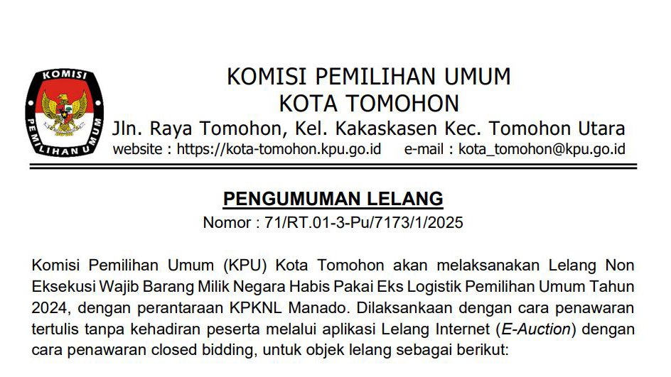 Komisi Pemilihan Umum (KPU) Kota Tomohon akan melaksanakan Lelang Non Eksekusi Wajib Barang Milik Negara Habis Pakai Eks Logistik Pemilihan Umum Tahun 2024, dengan perantaraan KPKNL Manado. Dilaksankaan dengan cara penawaran tertulis tanpa kehadiran peserta melalui aplikasi Lelang Internet (E-Auction) dengan cara penawaran closed bidding, untuk objek lelang sebagai berikut.
