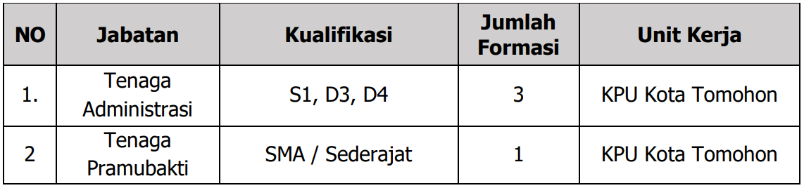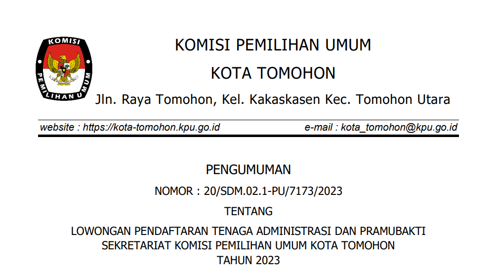 Pengumuman Lowongan Pendaftaran Tenaga Administrasi dan Pramubakti Sekretariat Komisi Pemilihan Umum Kota Tomohon Tahun 2023