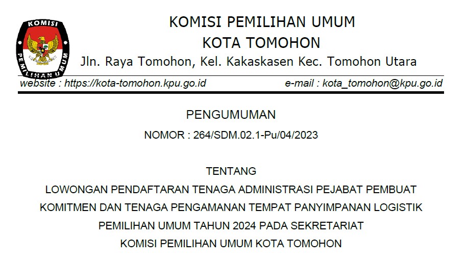Pengumuman Lowongan Pendaftaran Tenaga Administrasi Pejabat Pembuat Komitmen dan Tenaga Pengamanan Tempat Penyimpanan Logistik Pemilihan Umum Tahun 2024 pada Sekretariat KPU Kota Tomohon