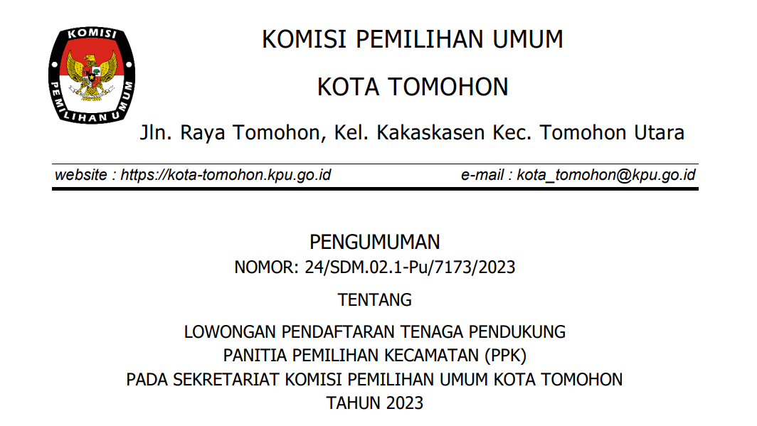 Pengumuman Lowongan Pendaftaran Tenaga Pendukung Panitia Pemilihan Kecamatan (PPK) pada Sekretariat Komisi Pemilihan Umum Kota Tomohon Tahun 2023