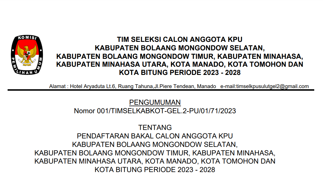 Pengumuman Pendaftaran Bakal Calon Anggota KPU Kota Tomohon Periode 2023-2028