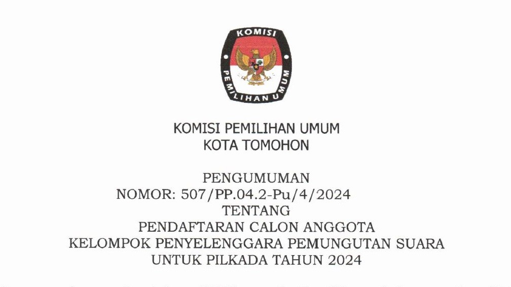 Dalam rangka pembentukan KPPS untuk Pemilihan Gubernur dan Wakil Gubernur serta Wali Kota dan Wakil Wali Kota Tahun 2024, Komisi Pemilihan Umum Kota Tomohon mengundang Warga Negara Indonesia yang memenuhi persyaratan untuk mendaftarkan diri menjadi anggota KPPS untuk Pemilihan Gubernur dan Wakil Gubernur serta Wali Kota dan Wakil Wali Kota Tahun 2024.