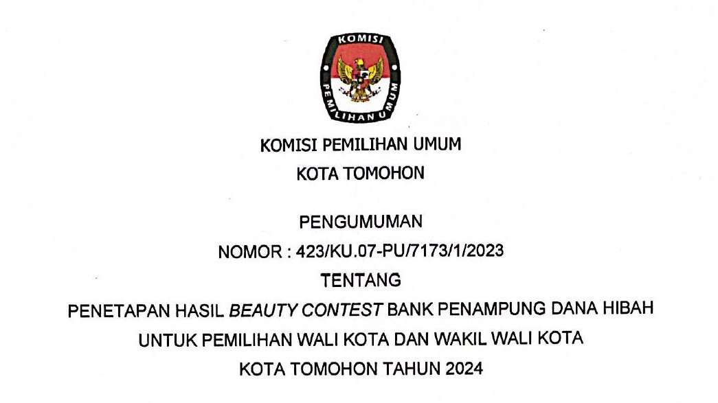Berdasarkan Berita Acara Hasil Seleksi Nomor: 364/KU.07-BA/7173/1/2023 tanggal 8 Desember 2023 tentang Penetapan Hasil Seleksi Beauty Contest Bank Penampung Danah Hibah untuk Pemilihan Wali Kota dan Wakil Wali Kota Tomohon Tahun 2024, bersama ini kami umumkan Pemenang Pemilihan Mitra Kerjasama Bank Penampung Danah Hibah, Selengkapnya klik PENGUMUMAN