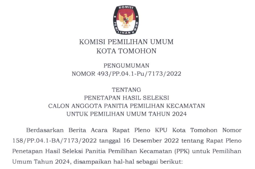 Komisi Pemilihan Umum Kota Tomohon telah menetapkan hasil seleksi Panitia Pemilihan Kecamatan (PPK) untuk Pemilihan Umum Tahun 2024. Bagi peserta yang dinyatakan LULUS harap untuk hadir dalam Pengambilan Sumpah/Janji, Pelantikan, dan Penandatanganan Pakta Integritas.