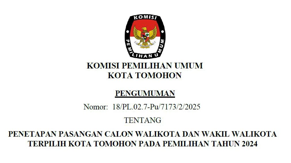 Berdasarkan Berita Acara dan Surat Keputusan Penetapan Pasangan Calon Walikota dan Wakil Walikota Terpilih Kota Tomohon pada Pemilihan Tahun 2024, Komisi Pemilihan Umum Kota Tomohon mengumumkan Salinan Keputusan Komisi Pemilihan Umum Kota Tomohon Nomor 10 Tahun 2025 tentang Penetapan Pasangan Calon Walikota dan Wakil Walikota Terpilih Kota Tomohon Tahun 2024 yang dapat diunduh pada link berikut : https://jdih.kpu.go.id/sulut/tomohon atau DOWNLOAD PENGUMUMAN