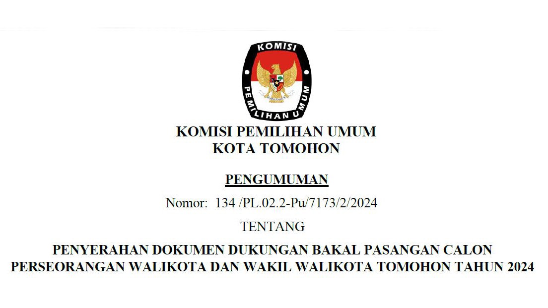 Pengumuman Penyerahan Dokumen Dukungan Bakal Pasangan Calon Perseorangan Wali Kota dan Wakil Wali Kota Tomohon Tahun 2024