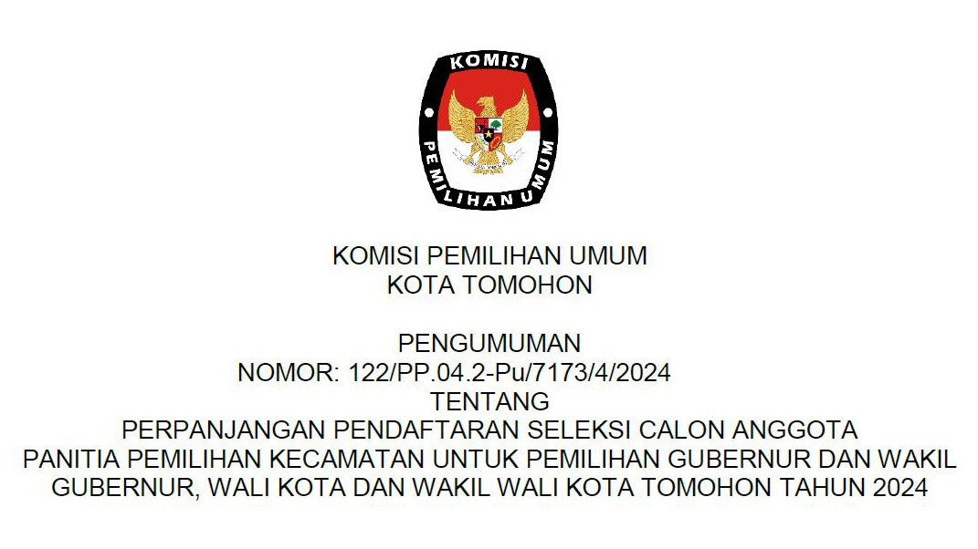 Pengumuman Perpanjangan Pendaftaran Seleksi Calon Anggota Panitia Pemilihan Kecamatan (PPK) untuk Pemilihan Gubernur dan Wakil Gubernur serta Wali Kota dan Wakil Wali Kota Tomohon Tahun 2024