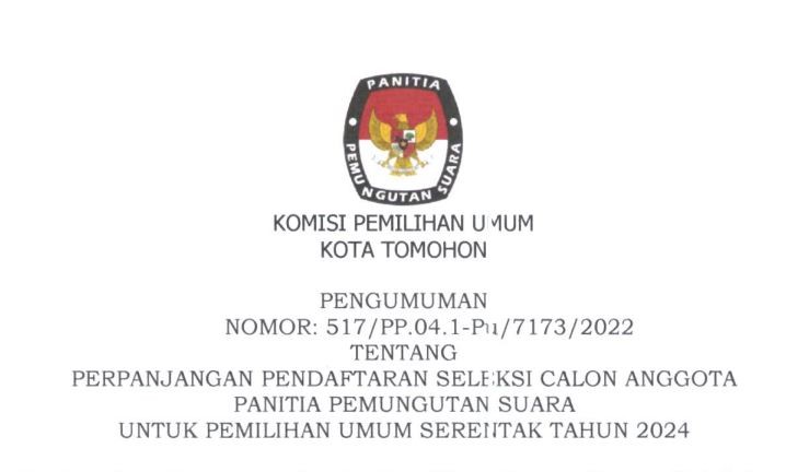 Komisi Pemilihan Umum Kota Tomohon mengumumkan perpanjangan pendaftaran Panitia Pemungutan Suara (PPS) Untuk Pemilihan Umum Tahun 2024.