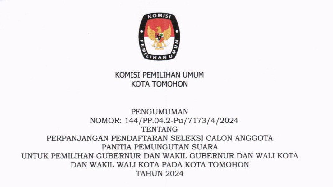 Pengumuman Perpanjangan Pendaftaran Seleksi Calon Anggota Panitia Pemungutan Suara untuk Pemilihan Gubernur dan Wakil Gubernur dan Wali Kota dan Wakil Wali Kota pada Kota Tomohon Tahun 2024