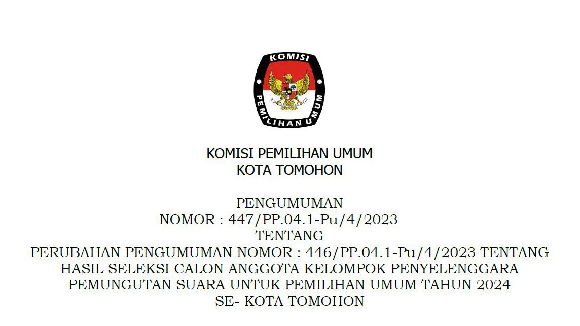 Pengumuman Perubahan Hasil Seleksi Calon Anggota Kelompok Penyelenggara Pemungutan Suara (KPPS) untuk Pemilihan Umum Tahun 2024 se-Kota Tomohon