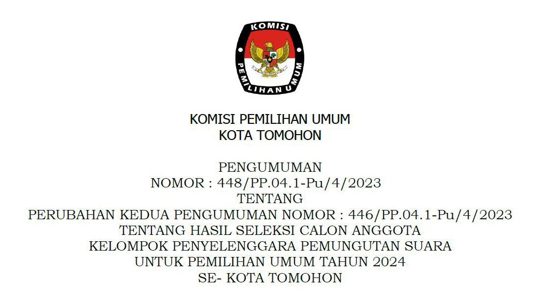 Pengumuman Perubahan Kedua Hasil Seleksi Calon Anggota Kelompok Penyelenggara Pemungutan Suara (KPPS) untuk Pemilihan Umum Tahun 2024 se-Kota Tomohon