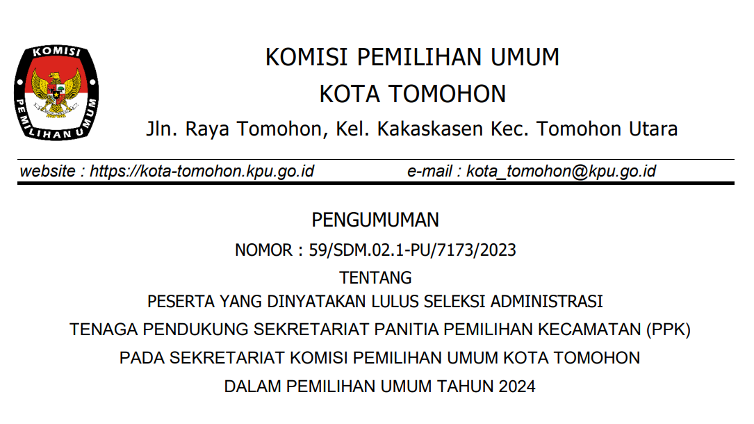 Pengumuman Peserta yang dinyatakan Lulus Seleksi Administrasi Tenaga Pendukung Sekretariat PPK pada Sekretariat KPU Kota Tomohon dalam Pemilihan Umum Tahun 2024