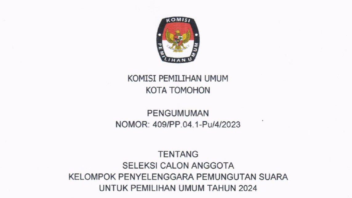 Dalam rangka pembentukan Kelompok Penyelenggara Pemungutan Suara (KPPS) untuk Pemilihan Umum Tahun 2024, Komisi Pemilihan Umum Kota Tomohon mengundang Warga Negara Indonesia yang memenuhi persyaratan untuk mendaftarkan diri menjadi anggota KPPS untuk Pemilihan Umum Tahun 2024.