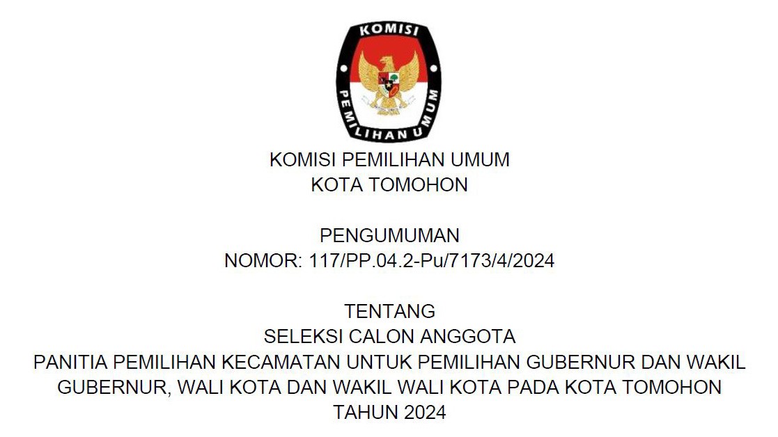 Pengumuman Seleksi Calon Anggota Panitia Pemilihan Kecamatan (PPK) untuk Pemilihan Gubernur dan Wakil Gubernur serta Wali Kota dan Wakil Wali Kota pada Kota Tomohon Tahun 2024