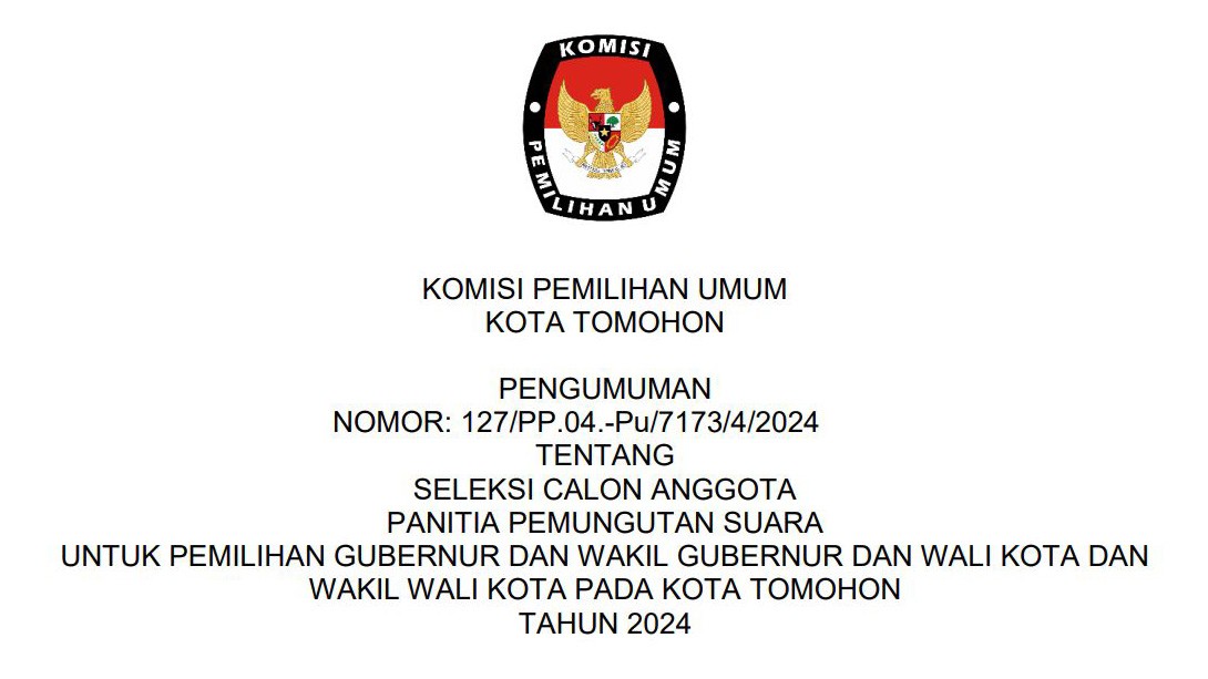 Pengumuman Seleksi Calon Anggota Panitia Pemungutan Suara (PPS) untuk Pemilihan Gubernur dan Wakil Gubernur dan Wali Kota dan Wakil Wali Kota pada Kota Tomohon Tahun 2024