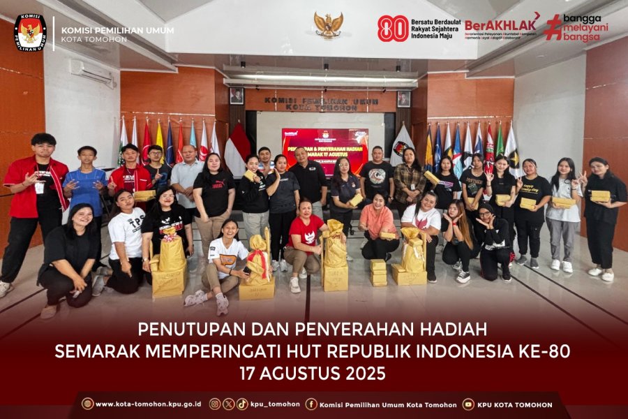 Tomohon, kota-tomohon.kpu.go.id - Dalam rangka memeriahkan HUT ke-80 Kemerdekaan Republik Indonesia, panitia pelaksana Semarak Lomba 17 Agustus 2025 telah menggelar berbagai kegiatan yang melibatkan partisipasi aktif dari jajaran Komisioner dan Sekretariat KPU Kota Tomohon. Setelah melalui rangkaian perlombaan yang berlangsung meriah sejak beberapa hari sebelumnya, akhirnya kegiatan ditutup dengan acara penutupan sekaligus penyerahan hadiah kepada para pemenang.