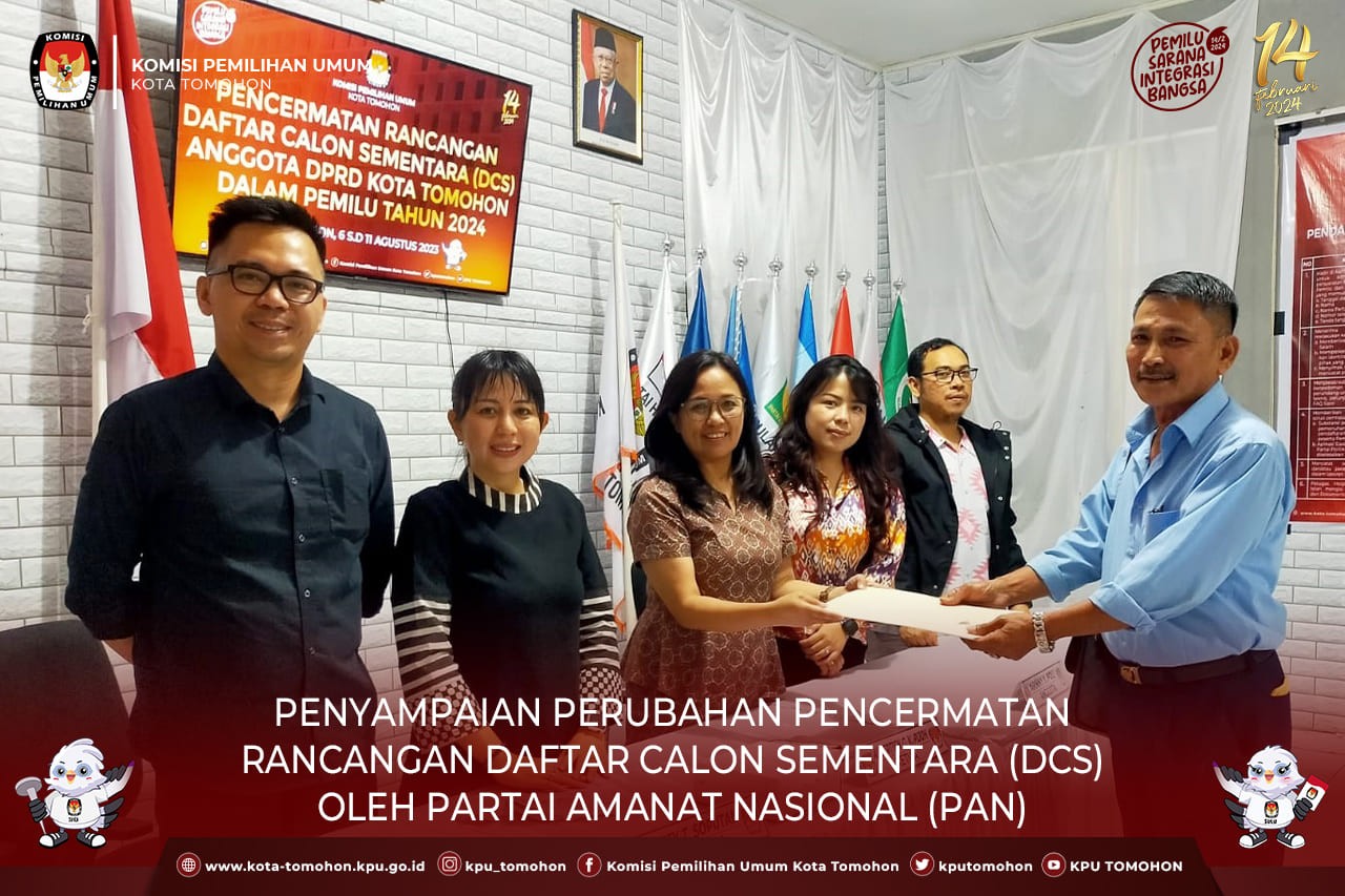 Partai Amanat Nasional (PAN) merupakan Partai Politik Keempat yang menyampaikan Perubahan Pencermatan Rancangan DCS Bakal Calon Anggota DPRD ke KPU Kota Tomohon.