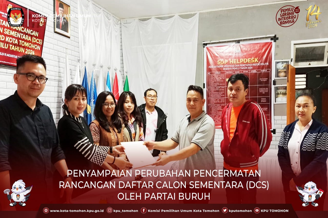 Partai Buruh merupakan Partai Politik Kesepuluh yang menyampaikan Perubahan Pencermatan Rancangan DCS Bakal Calon Anggota DPRD ke KPU Kota Tomohon.