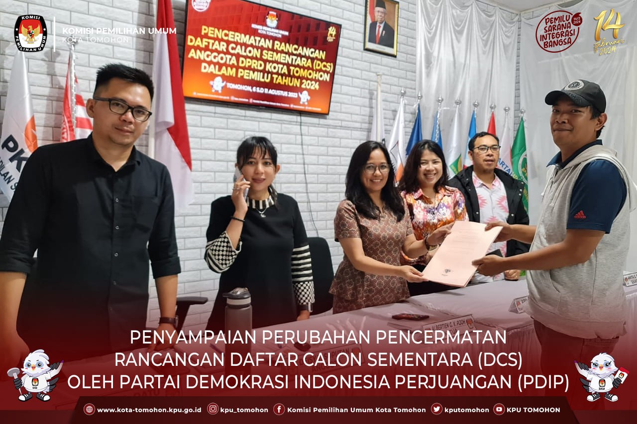 Partai Demokrasi Indonesia Perjuangan (PDIP) merupakan Partai Politik Kelima yang menyampaikan Perubahan Pencermatan Rancangan DCS Bakal Calon Anggota DPRD ke KPU Kota Tomohon.