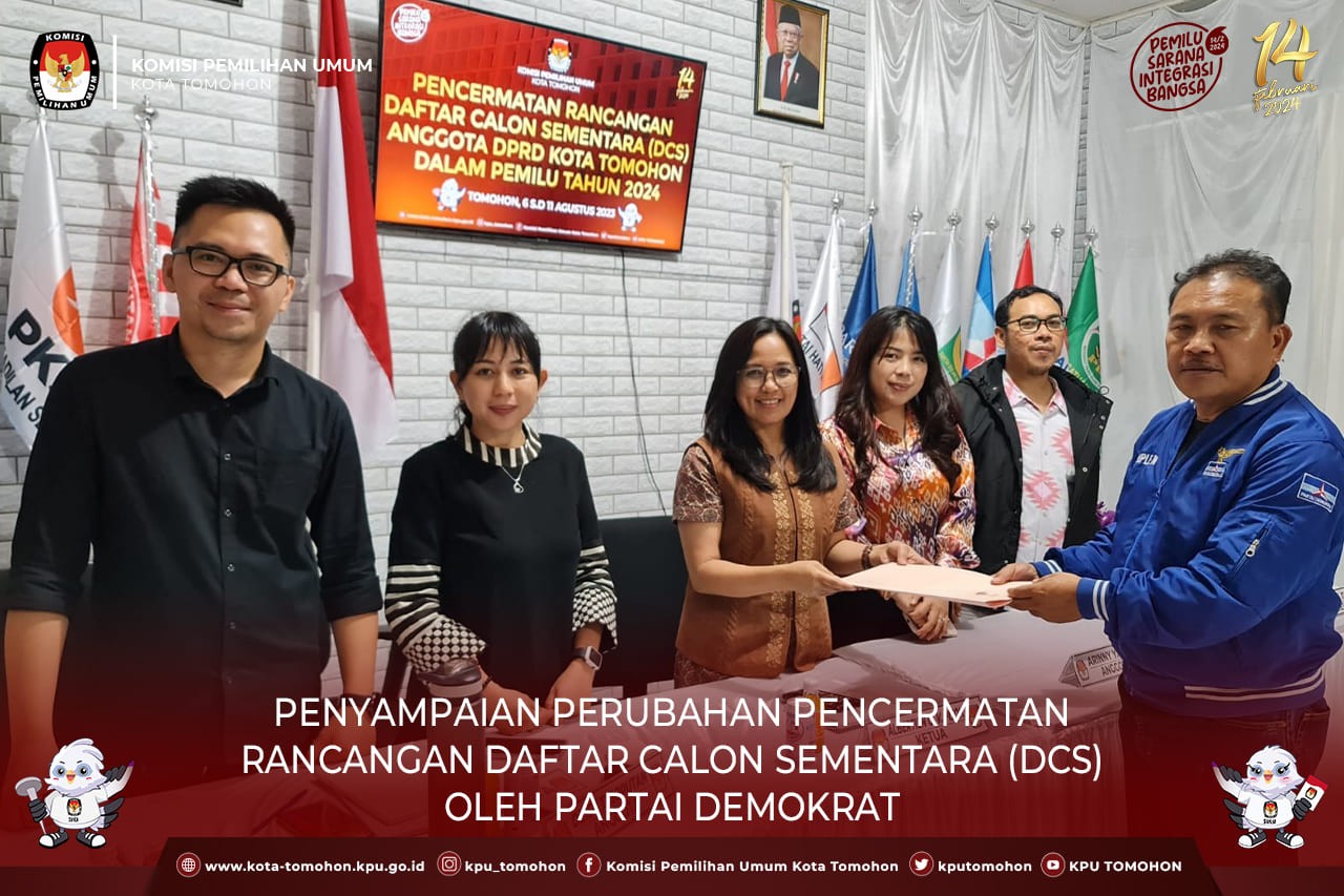 Partai Demokrat merupakan Partai Politik Ketujuh yang menyampaikan Perubahan Pencermatan Rancangan DCS Bakal Calon Anggota DPRD ke KPU Kota Tomohon.