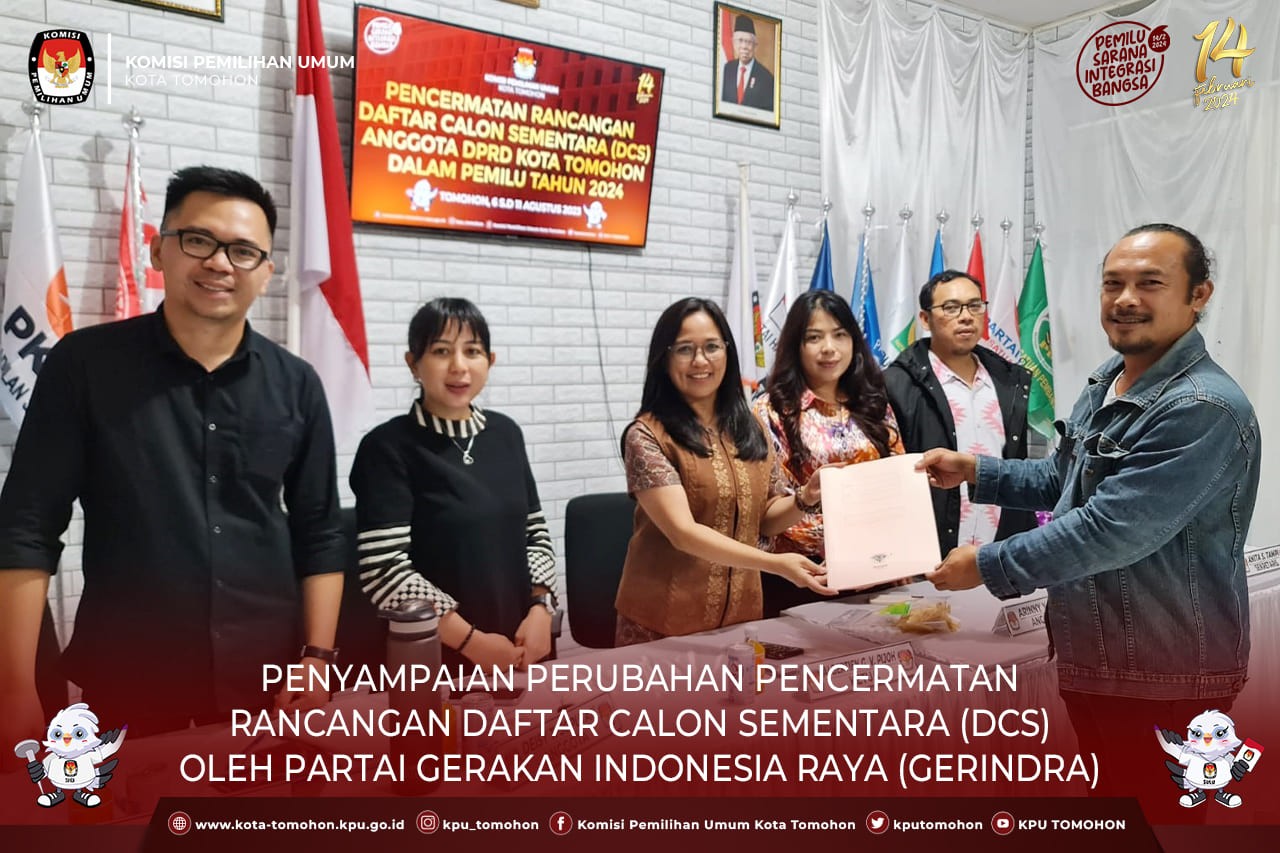 Partai Gerakan Indonesia Raya (Gerindra) merupakan Partai Politik Kedelapan yang menyampaikan Perubahan Pencermatan Rancangan DCS Bakal Calon Anggota DPRD ke KPU Kota Tomohon.