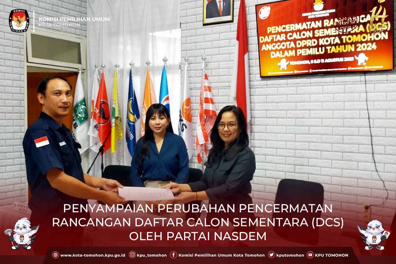 Partai Nasdem merupakan Partai Politik Pertama yang menyampaikan Perubahan Pencermatan Rancangan DCS Bakal Calon Anggota DPRD ke KPU Kota Tomohon.