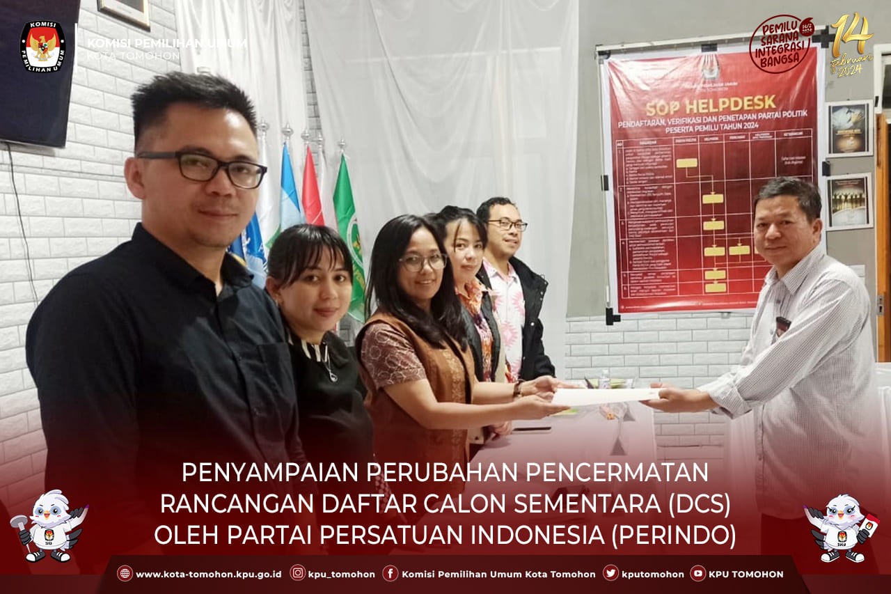 Partai Persatuan Indonesia (Perindo) merupakan Partai Politik Kesebelas yang menyampaikan Perubahan Pencermatan Rancangan DCS Bakal Calon Anggota DPRD ke KPU Kota Tomohon.