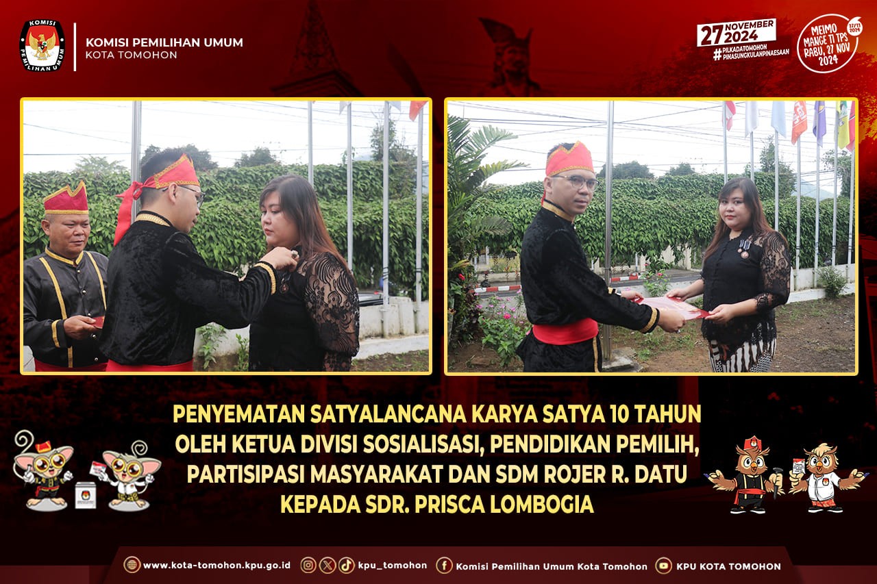 Tomohon, kota-tomohon.kpu.go.id - KPU Kota Tomohon menggelar Penyematan Satyalancana Karya Satya 10 Tahun Pengabdian sebagai Pegawai Negeri Sipil (PNS) pada Upacara Memperingati Hari Ulang Tahun Republik Indonesia ke-79. Penyematan oleh Inspektur Upacara Ketua Divisi Sosialisasi, Pendidikan Pemilih, Partisipasi Masyarakat dan SDM Rojer R. Datu kepada Saudara Prisca Lombogia.