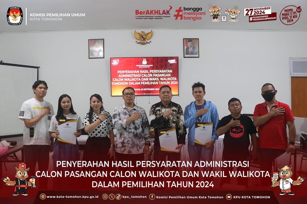 Dalam penyerahan hasil ini, KPU Tomohon menyerahkan dokumen resmi yang berisi status persyaratan administrasi yang akan diperbaiki masing-masing calon Walikota dan Wakil Walikota Tomohon kepada perwakilan pasangan calon baik dari perseorangan maupun partai politik serta Bawaslu Kota Tomohon.