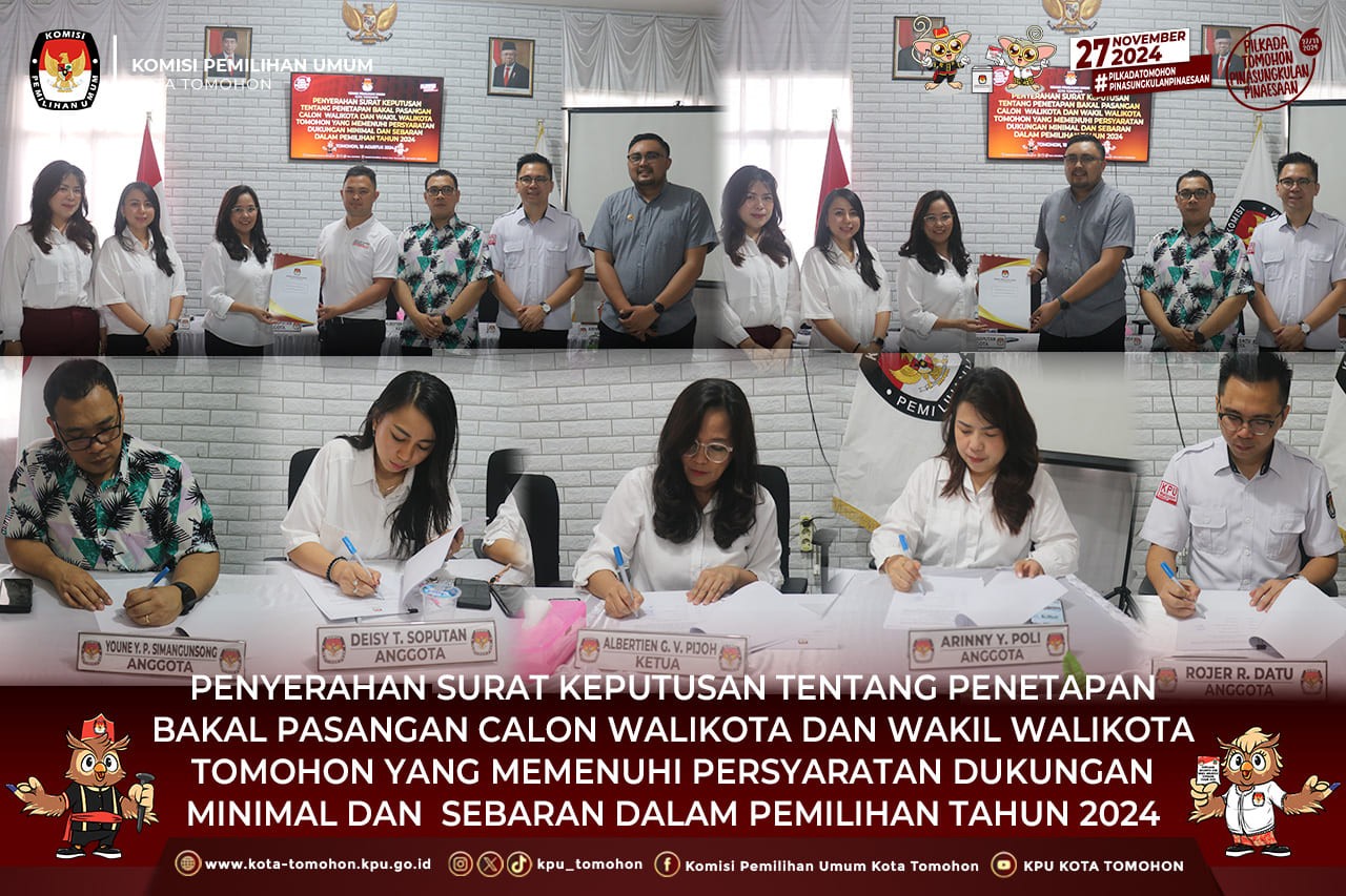 Tomohon, kota-tomohon.kpu.go.id - KPU Tomohon Melaksanakan Penyerahan Surat Keputusan tentang Penetapan Bakal Pasangan Calon Walikota dan Wakil Walikota Tomohon yang Memenuhi Persyaratan Dukungan Minimal dan Sebaran Dalam Pemilihan Tahun 2024 bertempat di Kantor KPU Tomohon, Senin (19/08).