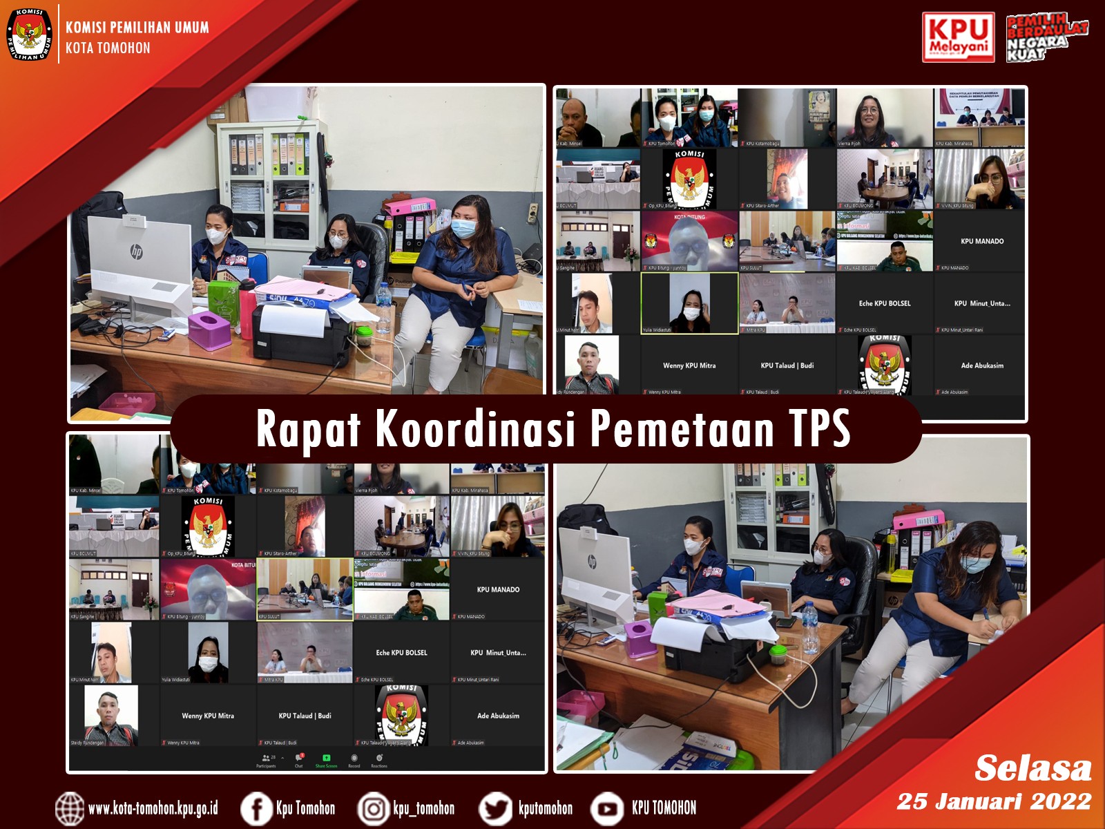 Tomohon, kota-tomohon.kpu.go.id - Tomohon, (25/01/2022) KPU Kota Tomohon mengikuti Rakor yang diselenggarakan oleh KPU Provinsi terkait Pemetaan Tempat Pemungutan Suara. Rapat Koordinasi dibuka langsung oleh Ketua Divisi Perencanaan Data dan Informasi Sulawesi Utara Lanny Anggriany Ointu, SE. kegiatan rakor dihadiri oleh Ketua Divisi Perencanaan dan Data, Kepala Sub Bagian Perencanaan dan Data serta Operator Sidalih.
